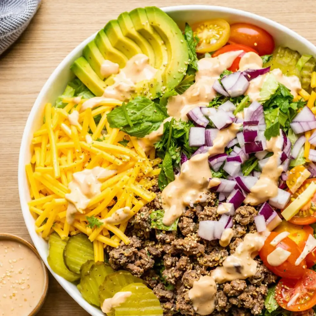 In a large serving bowl, add lettuce, tomatoes, avocado, red onion, cheddar cheese, and pickles. Top with the warm beef and sprinkle sesame seeds over the top for that true “burger” vibe. Serve with the dressing on the side, or toss everything together if you like it messy and extra flavorful.