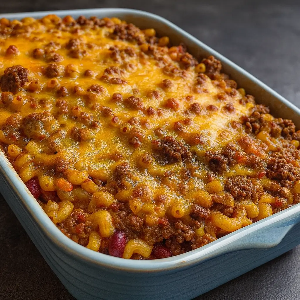 A hearty and comforting dish combining chili and macaroni in a baked casserole.