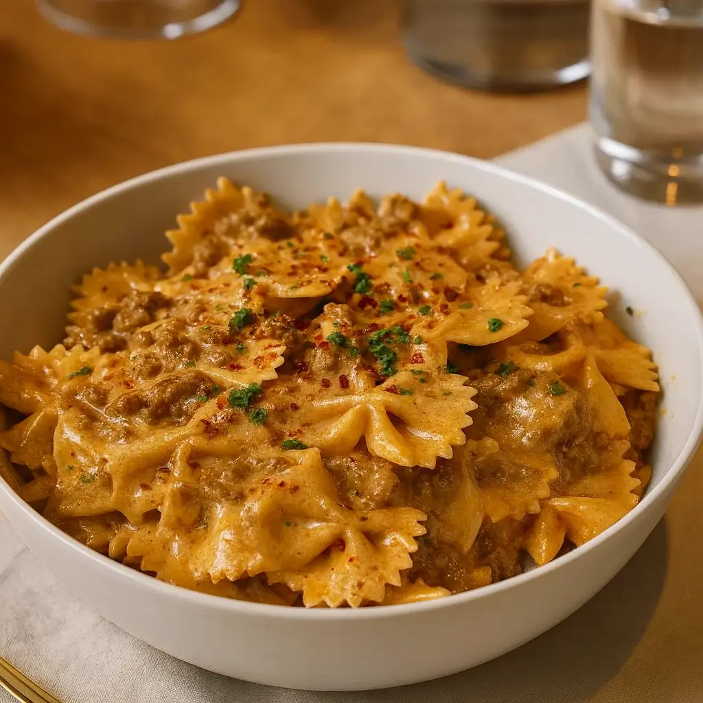 Tender bowtie pasta tossed in a creamy Parmesan garlic sauce with seasoned ground beef, delivering a quick, comforting, and flavorful meal perfect for any weeknight dinner.