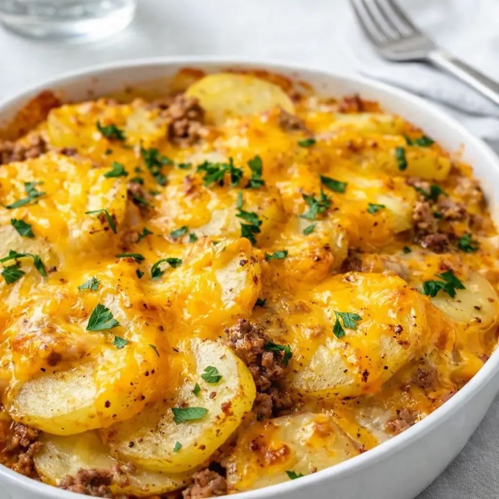 You start with browned ground beef, sautéed onions, and garlic, then layer it with thinly sliced potatoes and loads of cheese. As it bakes, the potatoes soak up the rich flavors from the beef and broth, creating that melt-in-your-mouth texture we all crave. It’s like a mix between scalloped potatoes and shepherd’s pie—easy, hearty, and seriously satisfying.