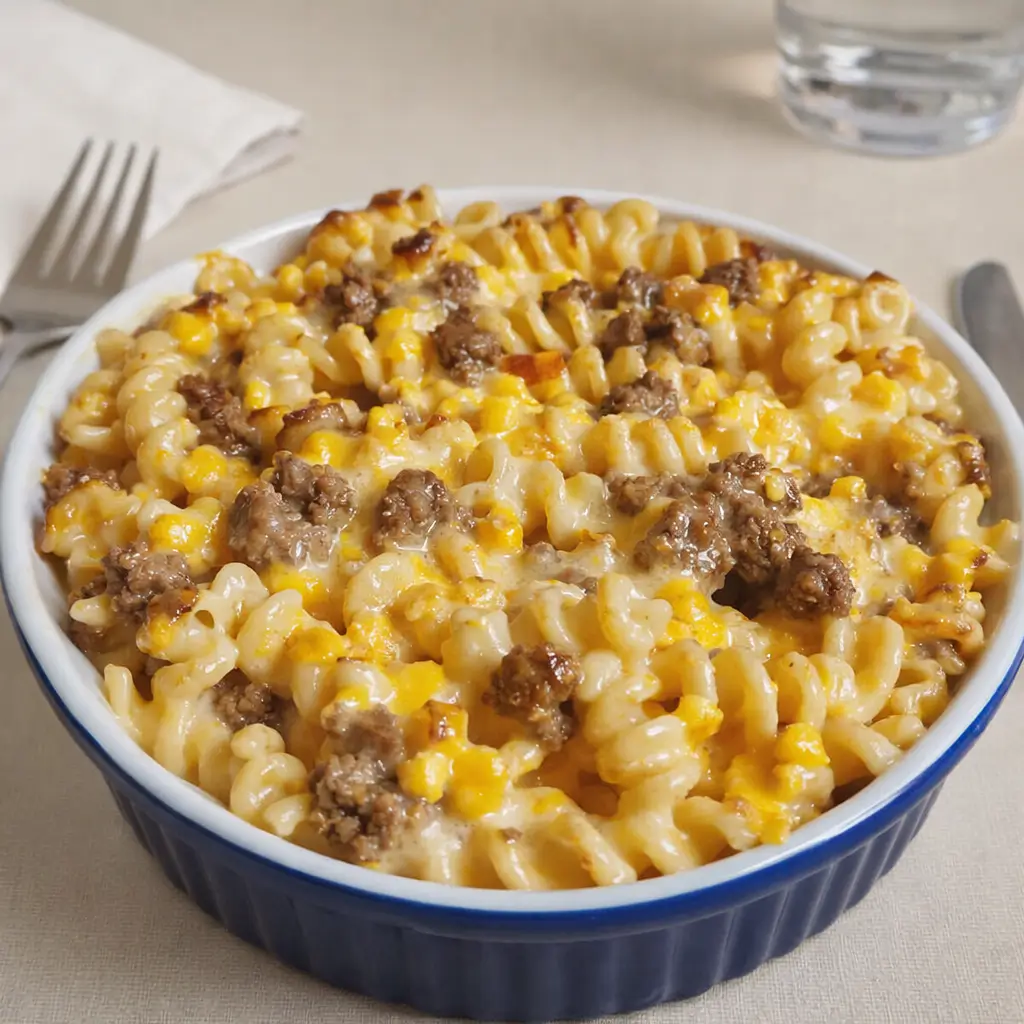 Preheat your oven to 375°F (190°C). In a large mixing bowl, combine cooked rotini, beef mixture, sweet corn, and cheese sauce. Stir everything together until it looks like cheesy heaven in a bowl.